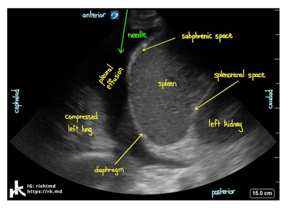 - Stichstelle: Hintere Axillarlinie, oberhalb der Rippe (Gefäß-Nerven-Bündel läuft unterhalb!)
